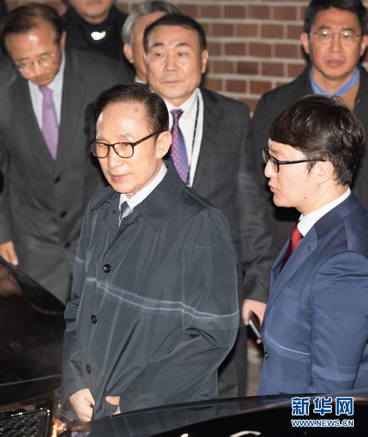 3月22日,在韩国首尔,韩国前总统李明博(前左)走出私宅。韩国首尔中央地方法院22日晚对前总统李明博签发逮捕令。李明博将成为韩国第4位因涉嫌贪腐而被捕的前总统。新华社发(李相浩 摄)