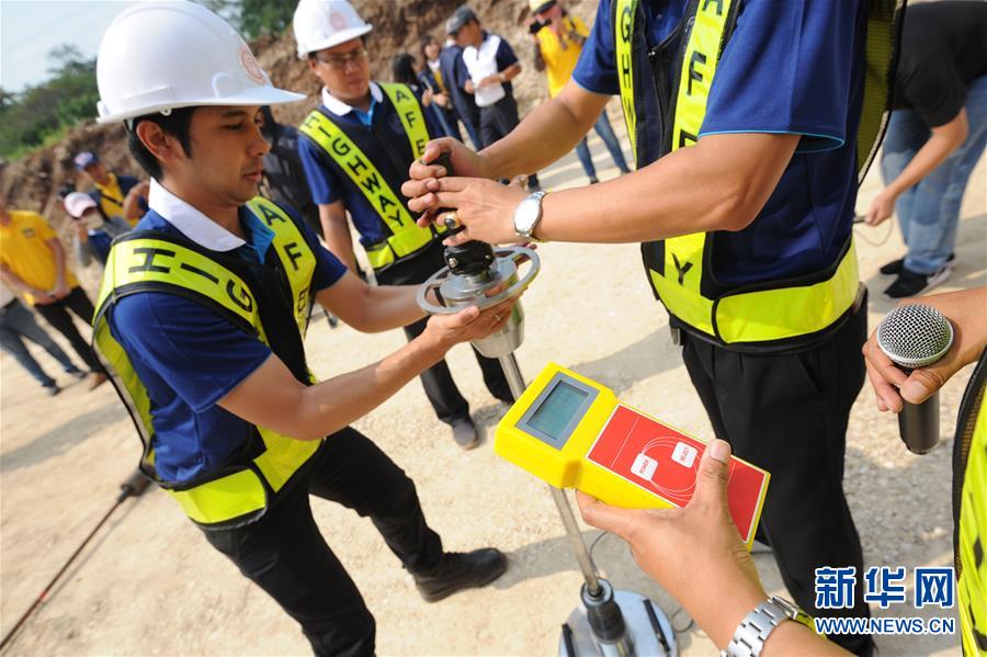 3月22日,在泰国呵叻府巴冲县的中泰铁路合作项目施工现场,泰国工程师展示轻型动力触探仪的使用。泰国交通部公路厅厅长塔宁·颂汶22日在泰国呵叻府巴冲县中泰铁路合作项目施工现场说,目前该项目一期首段的土建工程进展顺利,相关经验将会运用到其他段的施工中。新华社发(拉亨 摄)