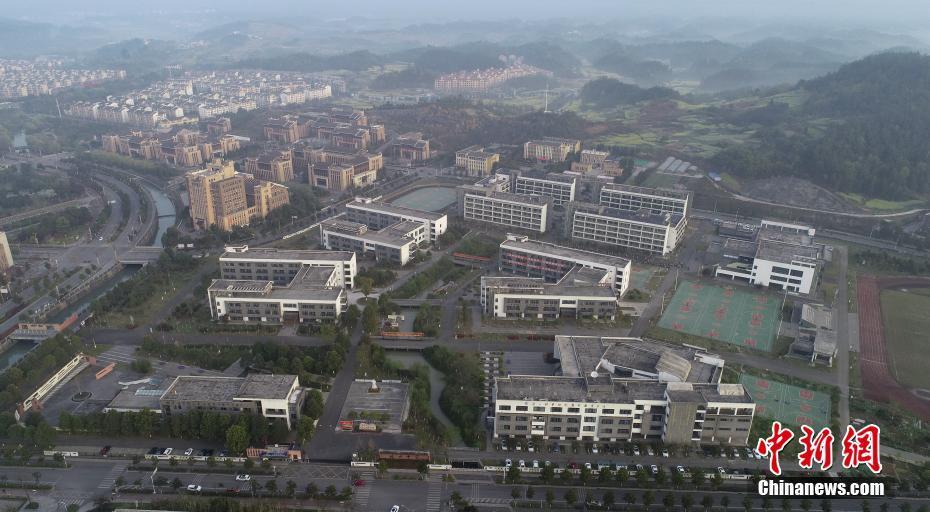 3月22日,空中俯瞰新北川县城内的北川中学。当日,四川北川新城迎来春日暖阳,新城地处黄土镇与安昌镇之间,距离北川老县城23公里,紧邻安昌河,依山傍水。中新社记者 刘忠俊 摄