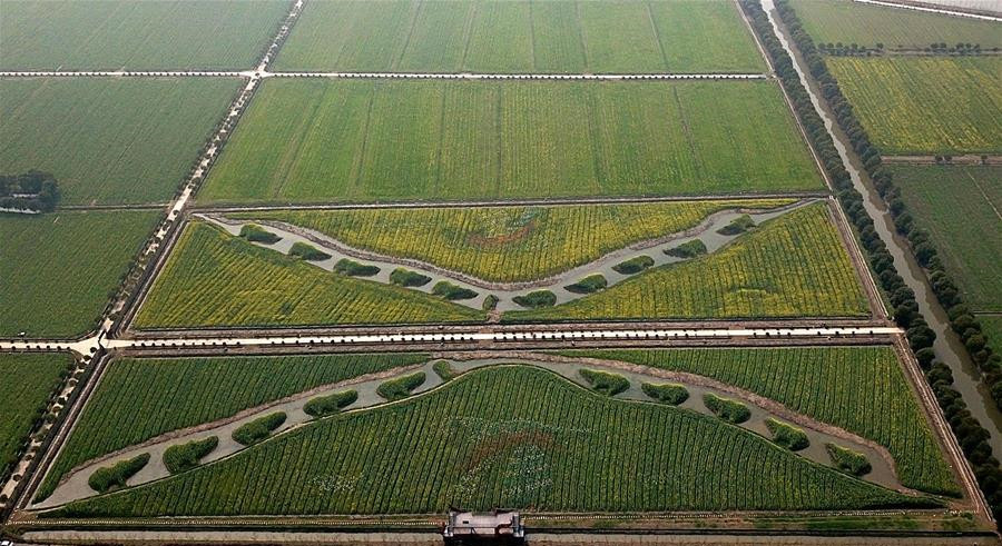 陆永忠艺术作品《风油季——海上丝绸之路》(3月23日无人机拍摄)。3月23日,正值油菜花开之际,由陆永忠艺术团队打造的大地艺术作品《风油季——海上丝绸之路》在上海奉贤区庄行镇的60亩油菜地里徐徐展开。由上海奉贤区庄行镇举办的油菜花节至今已经举办了11届,每年春季都会吸引数十万游客前来赏花踏青。(新华社记者 任珑 摄)