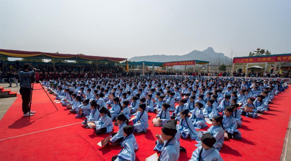 3月23日,学生们接受传统文化的洗礼。当天,在浙江省宁波市象山影视城大理皇宫举行千人“穿汉服学国学”学生汉服诗书大会,老师为孩子们讲授国学知识,向大家介绍孔子,教孩子们要正衣冠、拜孔子、诵国韵,在每一个孩子的额头上点一个朱砂。中新社记者 张陆沁 摄