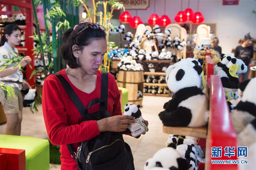 3月24日,在位于印度尼西亚茂物的印尼野生动物园大熊猫馆,一名游客在熊猫主题纪念品商店内选购商品。