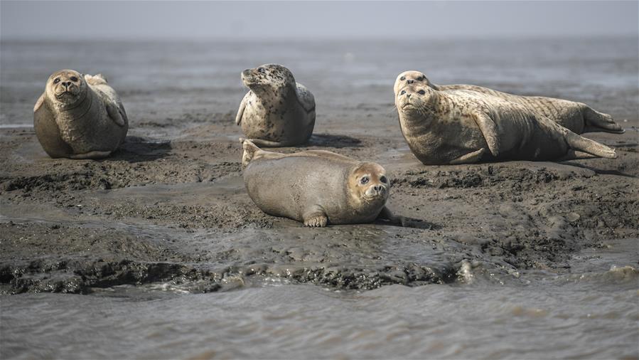 一群斑海豹在辽宁盘锦双台河口三道沟海域的滩涂上休息。据了解,每年2月到5月,成群的斑海豹都会洄游至辽河入海口处活动。目前在双台河口附近海域约有300余头斑海豹,这些斑海豹将在此处海域栖息至5月中旬,随后它们将逐渐离开辽东湾。 新华社记者 潘昱龙 摄 图片来源:新华网