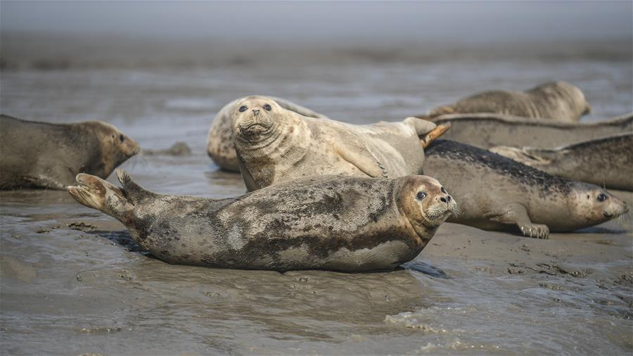 一群斑海豹在辽宁盘锦双台河口三道沟海域的滩涂上休息。 新华社记者 潘昱龙 摄 图片来源:新华网