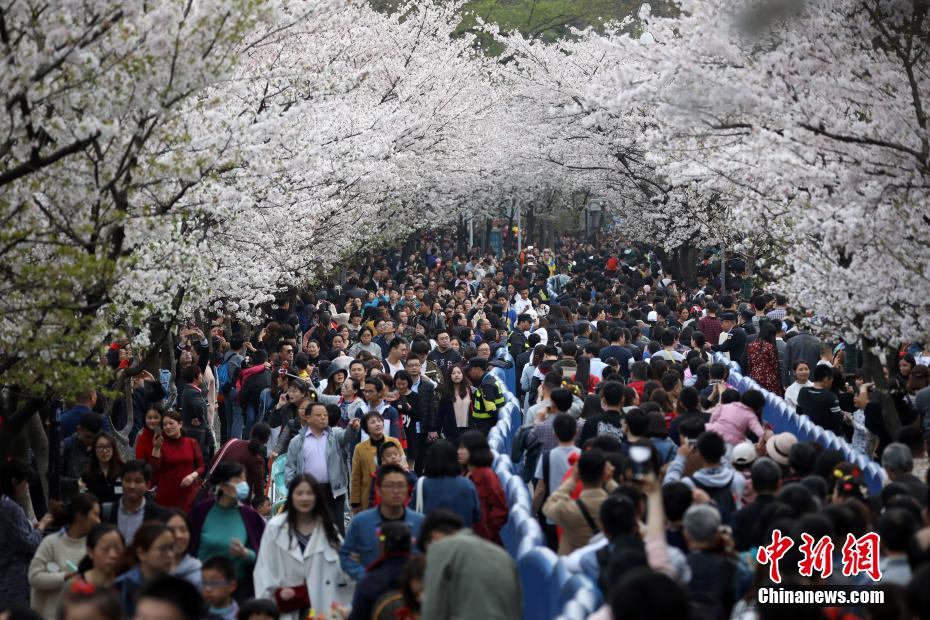 3月25日,南京鸡鸣古刹门前的樱花大道上樱花盛开,吸引了“赏樱大军”前来踏青赏花,沐浴着阳光感受春日气息。中新社记者 泱波 摄