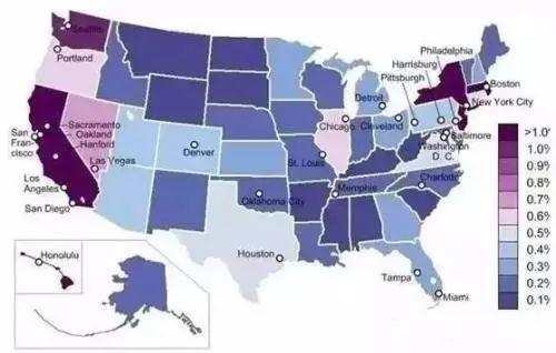 中新网3月27日电 美国侨报网编译称,据最新调查数据显示,目前美国华人最为集中的前五个区域为:加州,华裔人口占总华裔人口的36.9%;其次是纽约,华裔人口占总华裔人口的16.9%;新泽西州,占4.4%;得有12万多人,占4.2%;华盛顿州有8万多人,占2.8%。