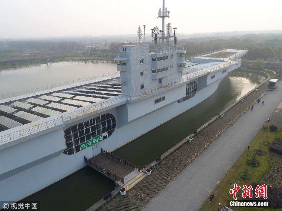 近日,一艘体型巨大的“航空母舰”出现在上海浦东临港地区,该航母紧邻鲜花港的一处绿地中,游人从远处经过,仿佛是一艘真正的航空母舰经停此处。据悉,该“航母”其实是一座钢筋水泥浇灌的“航空母舰”外形的建筑。该建筑长度约100米,高度超过10米,外形酷似航空母舰,舰体上舰桥、雷达、火炮一应俱全,十分逼真。目前甲板上都是太阳能板,建筑内部则是一座剧场,入口处上方悬挂着“航母剧场”四字标牌。