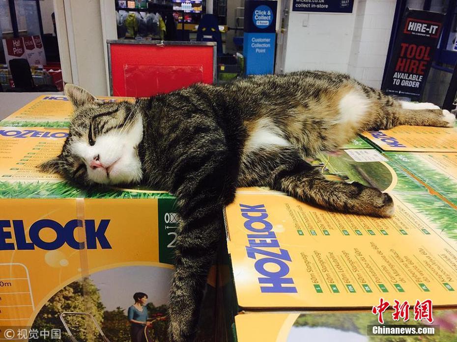 2018年3月26日讯(具体拍摄时间不详),英国牛津市比斯特镇,一只爱冒险的英国短毛猫史蒂夫每天从主人家走将近2500米到一家DIY(自制手工)商店,它无法抗拒店里汉堡诱人的香气,又被店里工作人员喂它的肉所吸引,于是开始每天“光顾”。它经常在自制产品和家居用品附近闲逛,员工们和顾客们非常喜欢这只猫。员工们甚至为他创建了一个Facebook(脸书)页面。图片来源:视觉中国