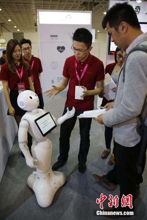 3月27日,2018智慧城市论坛暨展览在台北南港展览馆开幕,200余家厂商参展,展位逾千个。图为智能机器人吸引民众关注。中新社记者 陈小愿 摄