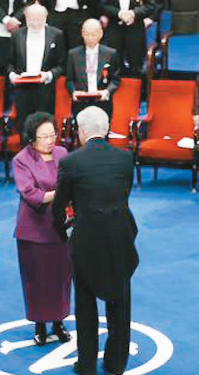 屠呦呦在斯德哥尔摩音乐厅领取诺贝尔奖和证书