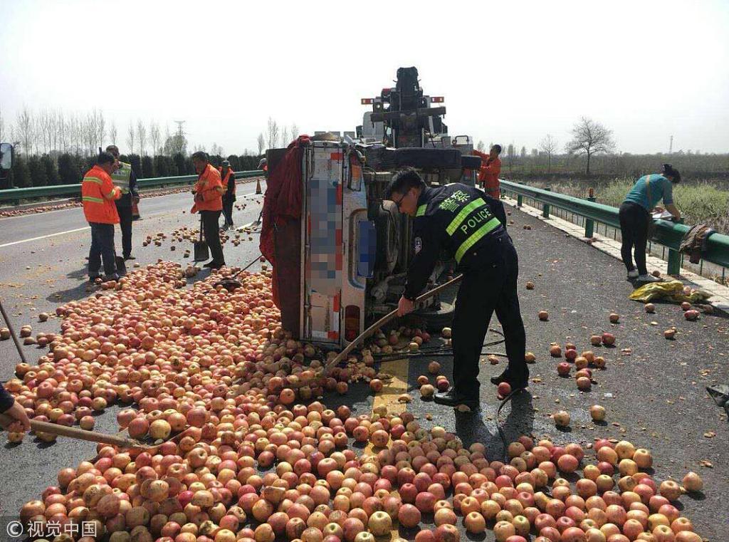 1.5吨苹果散落路面 警察帮捡拾