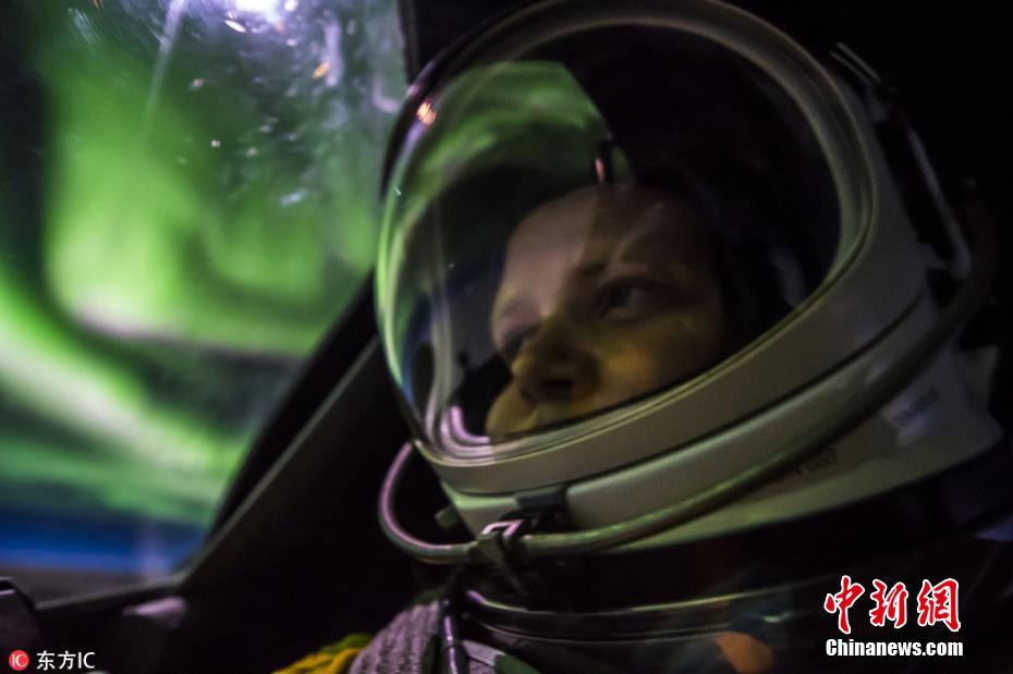 照片中,美国飞行员Ross Franquemont坐在飞机驾驶舱中自拍,绿色的北极光映照在他的头盔上,萦绕在飞机的玻璃窗外。图片来源:东方IC 版权作品 请勿转载