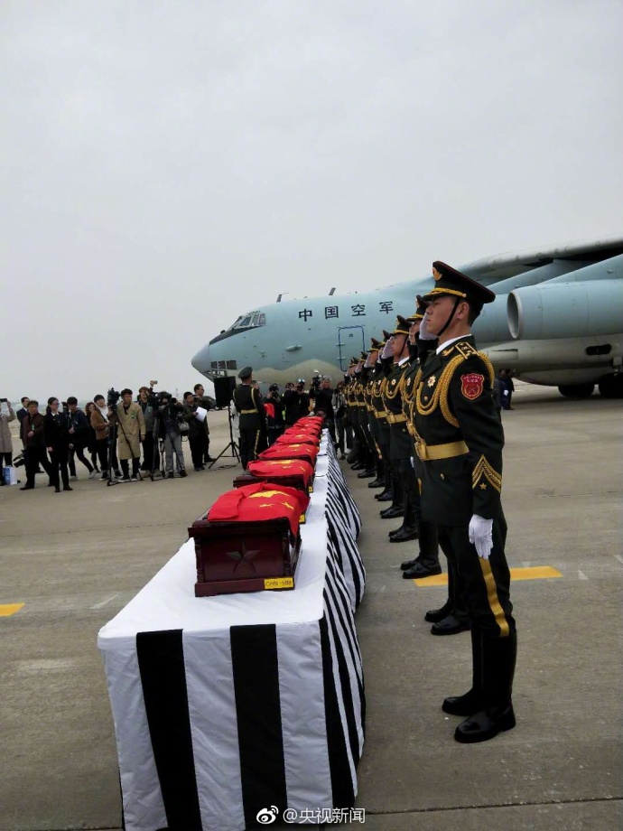 ​天上午,中韩双方在韩国仁川机场对2017年发掘确认的20具志愿军烈士遗骸进行交接。中方礼兵双手托起棺木,列队登上中国人民解放军空军接运专机。今天,一起接#英雄回家#!传递!致敬!(央视记者窦筠韵)