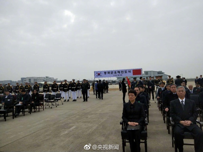 当地时间3月28日上午10时,中韩双方在韩国仁川机场对2017年发掘确认的20位志愿军烈士的遗骸进行了交接。中国人民解放军仪仗队士兵从韩方士兵手中接回收殓志愿军烈士遗骸的棺木。中国驻韩国大使邱国洪为每具棺木盖上五星红旗,并轻轻将国旗铺好、展平。