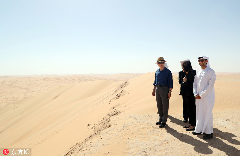 当地时间2018年3月26日,阿联酋阿布扎比,韩国总统文在寅在参观布拉卡核电站后,在沙漠脱了鞋感受黄沙,听当地人讲靠鹰打猎,甚至伸出手臂,让猎鹰站在他的手臂上。