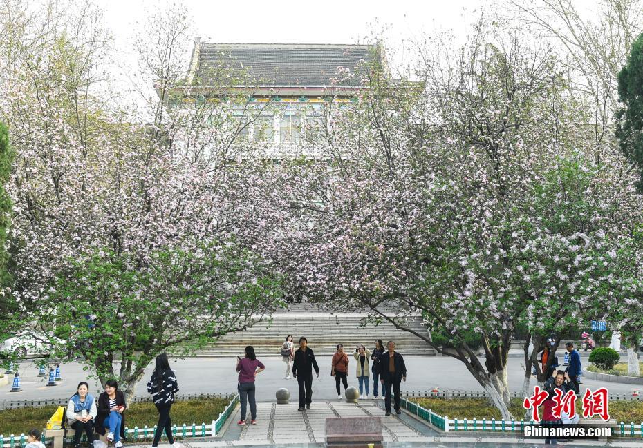 山东师范大学济南千佛山校区街道两旁的数百株红叶李、海棠花绽放。 中新社记者 张勇 摄