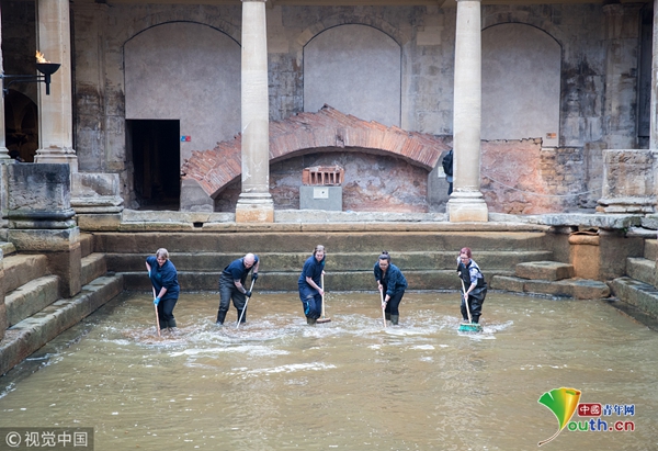 当地时间2018年3月27日,英国巴斯,巴斯著名景点古罗马浴场启动春季清洁工作,清洁工作需排干25万升温泉水,工作人员清理藻类和淤泥。