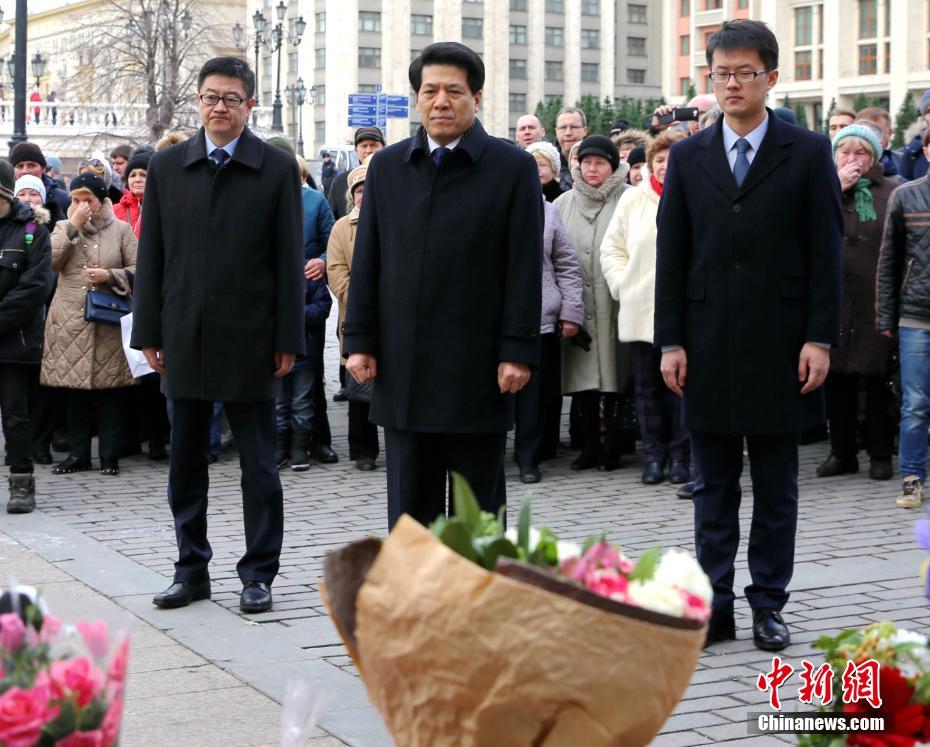 当地时间3月28日,俄罗斯迎来全国哀悼日。当天所有文化娱乐场所停止一切公共娱乐活动,电视广播也停播娱乐节目。莫斯科民众自发前往市中心的马涅什广场,为遇难者献上鲜花、气球和毛绒玩具等物品。本月25日,俄罗斯西伯利亚南部城市克麦罗沃一家名为“冬季樱桃”的购物中心发生火灾,造成64人死亡,其中不少遇难者是儿童。图为中国驻俄罗斯大使李辉(前排中)及中国驻俄使馆工作人员(前排左一、右一)前往莫斯科马涅什广场悼念克麦罗沃火灾遇难者。 中新社记者 王修君 摄