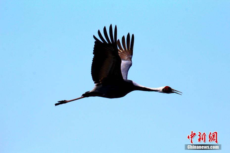 近日,随着中国北方天气转暖,冰雪消融,首批候鸟飞回三江平原的七星河国家级自然保护区报春,这比往年提前了10多天,接下来的一个月左右,数十万只候鸟也将陆续飞回这里。图为白枕鹤。 中新社记者 钟欣 摄