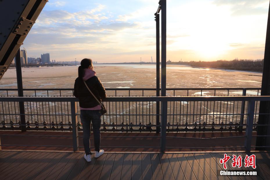 3月28日,哈尔滨松花江铁路桥附近的江面,冰层大部分都已融化。哈尔滨连续多日气温达到20℃,致使松花江哈尔滨市区段出现“半江流水 半江冻冰”的特殊景象。 中新社记者 于琨 摄