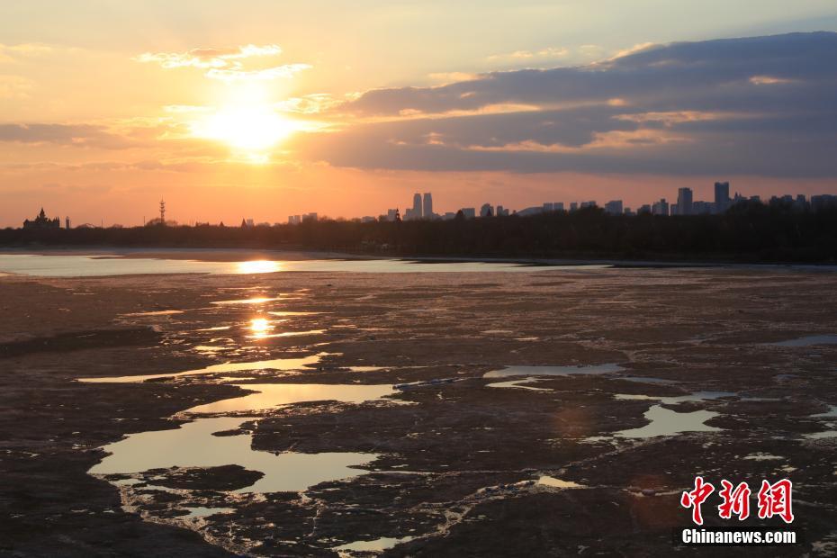 3月28日,哈尔滨松花江铁路桥附近的江面,冰层大部分都已融化。哈尔滨连续多日气温达到20℃,致使松花江哈尔滨市区段出现“半江流水 半江冻冰”的特殊景象。 中新社记者 于琨 摄