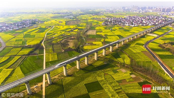 2018年3月25日,陕西汉中,一列西成高铁动车组在油菜花海中穿行。雷婧/华商报/视觉中国