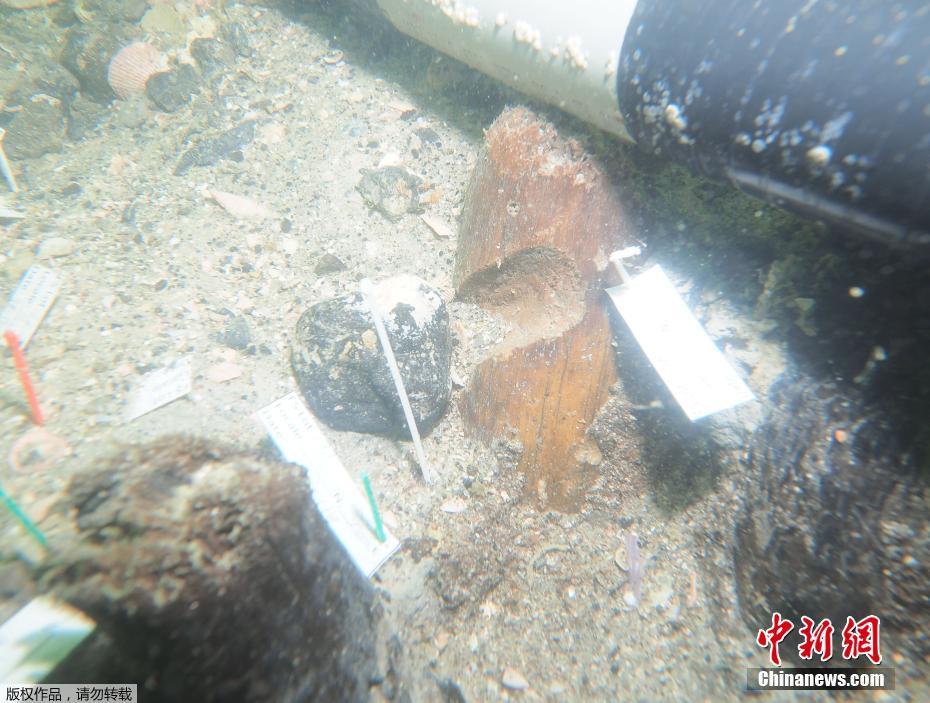 考古人员在这个水下墓地中发掘出来一根有豁口的柱子。