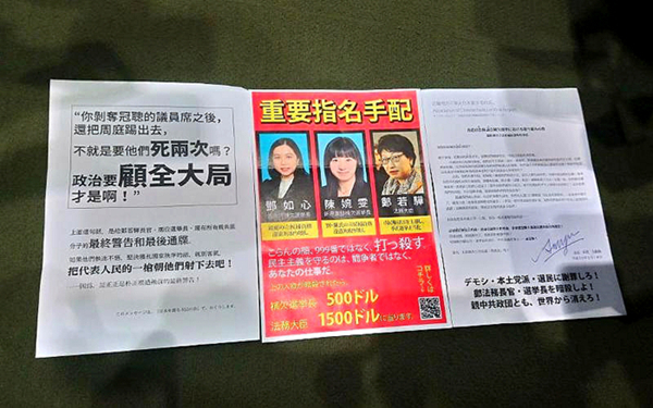 有建制派议员展示收到的日文恐吓信,部分是以中文撰写,信中夹杂有大量辱华字句,据地址写有所谓的“香港国”等字眼。文中先斥责涉及立法会宣誓风波、立法会补选中多宗取消资格事件,又直言要“请用郑若骅长官的命,用两位选举主任的命”来“票债血偿”,另又以特大字体写上“暗杀郑若骅长官·选举长”、亲建制政团要“从世上消失”等字句。信中另附一张以日文写成的“通缉令”,印上郑若骅、陈婉雯及邓如欣的近照,并列出其所谓“罪状”,开价500美元至1500美元不等要求暗杀3人。