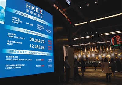 图为香港交易所大厅内拍摄的恒生指数收盘情况。(资料照片)