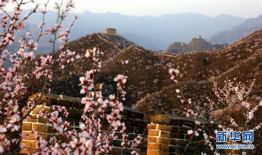 这是山花映衬下的北京市怀柔区黄花城古长城(3月29日摄)。 新华社发(卜向东 摄)