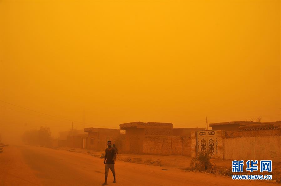 3月29日,人们走在苏丹首都喀土穆街头。苏丹首都喀土穆29日遭遇强沙尘暴袭击,能见度不足200米。喀土穆国际机场已经暂停所有国内和国际航班起降。新华社发(穆罕默德·凯德尔摄)