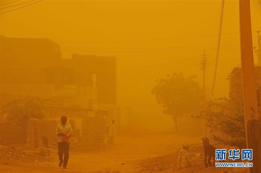 3月29日,人们走在苏丹首都喀土穆街头。苏丹首都喀土穆29日遭遇强沙尘暴袭击,能见度不足200米。喀土穆国际机场已经暂停所有国内和国际航班起降。新华社发(穆罕默德·凯德尔摄)