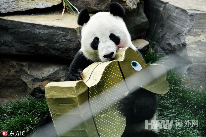 当地动物园为旅居澳大利亚的大熊猫“网网”准备了一个复活节“兔子”,“网网”高兴地抱着“兔子”大啃特啃。