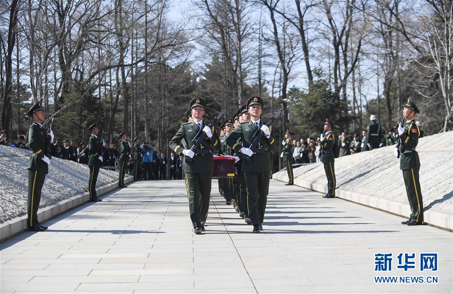 3月29日,礼兵在安葬仪式上护送志愿军烈士遗骸棺椁。当日,第五批在韩中国人民志愿军烈士遗骸在沈阳抗美援朝烈士陵园安葬。20位志愿军烈士英灵60多年后回到祖国和人民的怀抱,在中华大地上安息。新华社发(龙雷 摄)