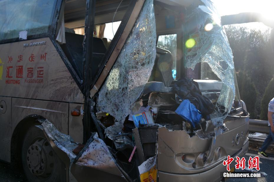 3月29日,四川德昌,事故现场受损的大客车。当日下午,京昆高速四川凉山德昌往西昌方向2312公里处,发生一起客运汽车与大货车相撞的交通事故,造成1人死亡,38人送往医院检查。事故原因高速交警正在调查中。中新社记者 凉小轩 摄
