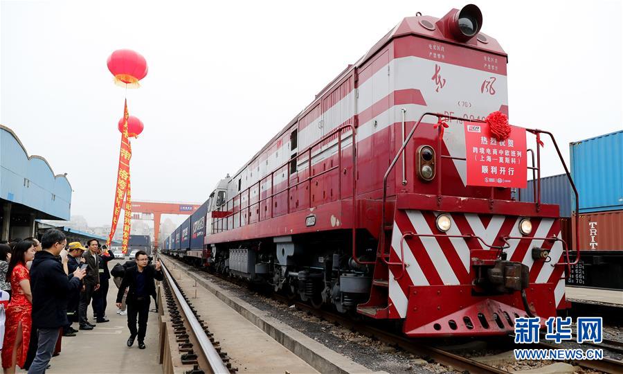 3月30日,一列上海开往莫斯科的中欧班列在发车仪式上。当日,由上海开往莫斯科的一带一路跨境电商中欧班列货运列车在上海杨浦站发车,助力中欧间跨境电商物流运输。 新华社记者 方喆 摄