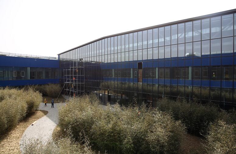 雄安市民服务中心项目的政治高度和基于鲁班奖标准进行建造的定位,决定了只能一次成功,一次成优。为此,建设者们“不眠不休”,甚至春节也是在工地上度过。图为中建装饰工人对项目外立幕墙做最后调试。(摄影:海外网 谢明)