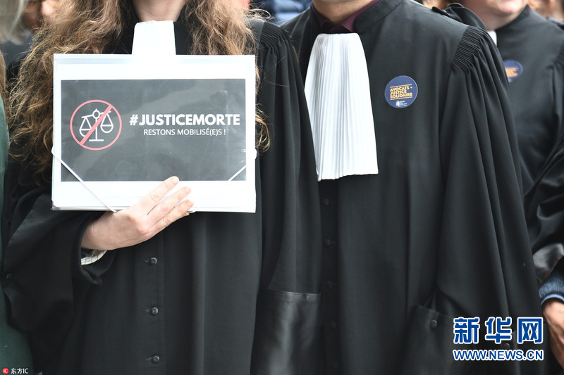 3月30日,法国楠泰尔,来自法国律师联盟和地方法官联盟的约50名律师“躺尸”抗议,反对司法改革。(图片来源:东方IC)
