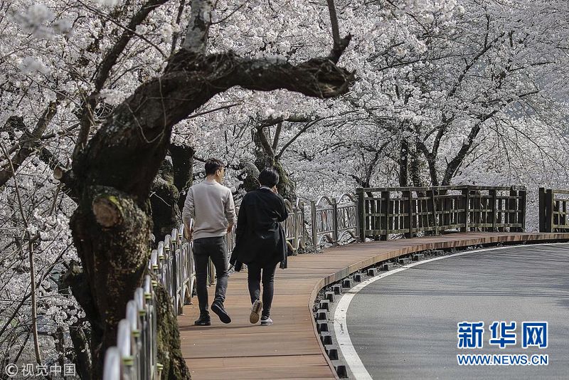 3月30日,韩国河东郡,当地樱花盛开,吸引游人观赏。(图片来源:视觉中国)