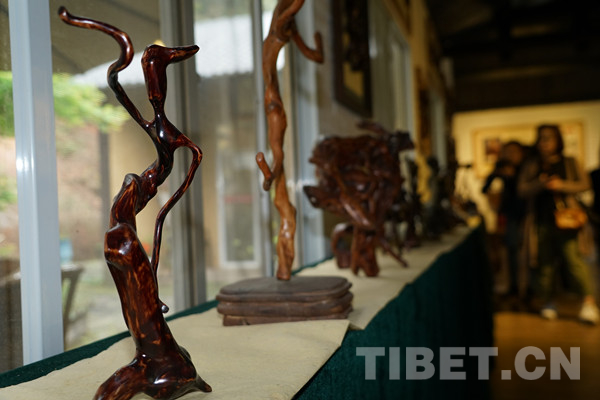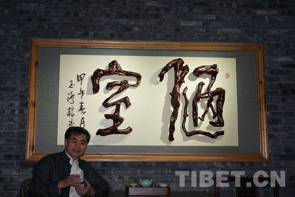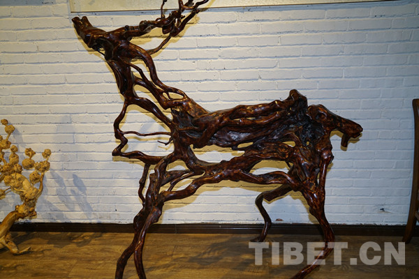 中国西藏网讯 根书,多半取材自高山杜鹃根创作而成,既有传统根艺的艺术精华,也有传统书法的神韵美感,更有立体艺术效果。一套成熟的根书作品,需要经过选材、拼版、烘干、去皮、抛光、打磨、着色上漆等38道工序,用艺术的手法拼接成独具特色的书法艺术作品。图为根书作品《鹿》。