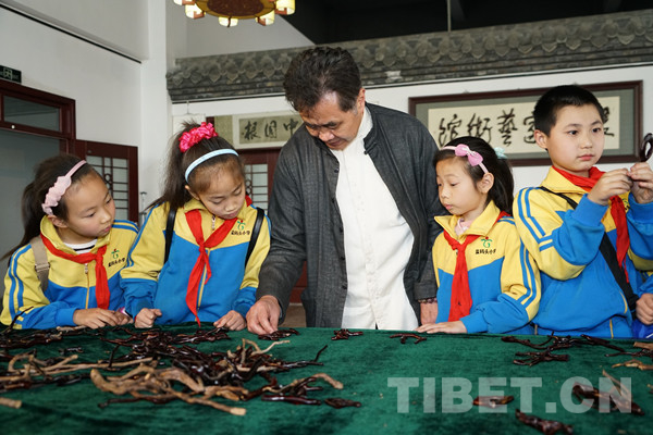 自根书艺术馆开馆以来,已经免费接待国内外游客和本地市民20余万人次,先后与乐山实验小学、五通桥实验小学等合作,开展多形式的根书艺术教育实践,激发广大青少年对我国传统文化的兴趣和爱国热情。针对家境贫困的学生,杨玉冰先生分文不取倒贴食宿费,只为传承中华文化。图为杨玉冰亲自教导学生们如何选取根书材料。