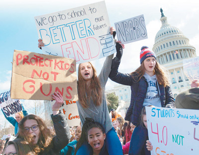 主张枪支自由的利益团体在美国选举政治中举足轻重,特朗普政府依旧囿于利益对控枪态度暧昧引发民众不满。图为2018年3月14日,美国学生在华盛顿游行呼吁加强对枪支管控。 人民视觉