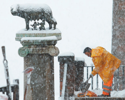 由于当地政府行政效率长期低下难解,经常让意大利首都罗马等地因大雪等突发状况陷入“瘫痪”。图为2018年2月26日,一名清洁工在罗马市政府外清除积雪。 新华社发