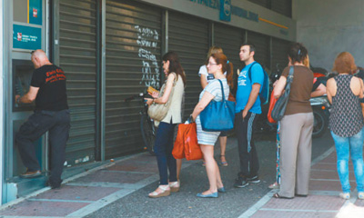 希腊债务危机于2015年大选后急剧恶化,引发国内挤兑“狂潮”。图为2015年7月2日,雅典民众在取款机前排队取钱。 本报记者 韩秉宸摄