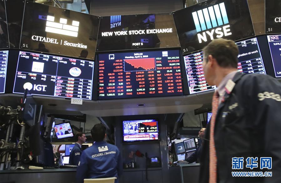 4月2日,交易员在美国纽约证券交易所工作。纽约股市三大股指2日收盘下跌,其中,道琼斯工业平均指数比前一交易日下跌458.92点,收于23644.19点,跌幅为1.90%。新华社记者王迎摄