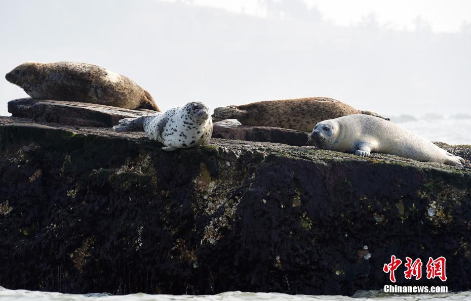 4月2日,在山东省长岛县钓鱼岛景区附近海域,几只斑海豹趴在海中的礁石上晒太阳,憨态可掬。每年三、四月,成群的斑海豹从俄罗斯迁徒到山东省长岛海域栖息、繁衍。斑海豹是国家二级野生保护动物,在中国主要分布于渤海、黄海海域。中新社发 方毅 摄