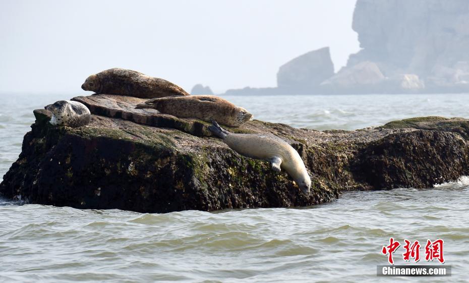 4月2日,在山东省长岛县钓鱼岛景区附近海域,几只斑海豹趴在海中的礁石上晒太阳,憨态可掬。每年三、四月,成群的斑海豹从俄罗斯迁徒到山东省长岛海域栖息、繁衍。斑海豹是国家二级野生保护动物,在中国主要分布于渤海、黄海海域。中新社发 方毅 摄