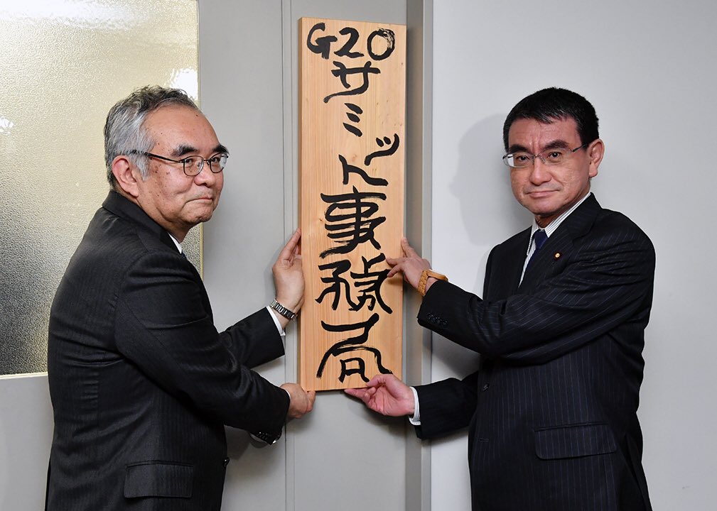 2日,河野太郎发文称,“日本外务省成立了G20峰会事务局。G20峰会将于明年(2019年)6月28日至29日在大阪召开,是日本举办的史上最大的峰会。鄙人不才,题字是我写的。”
