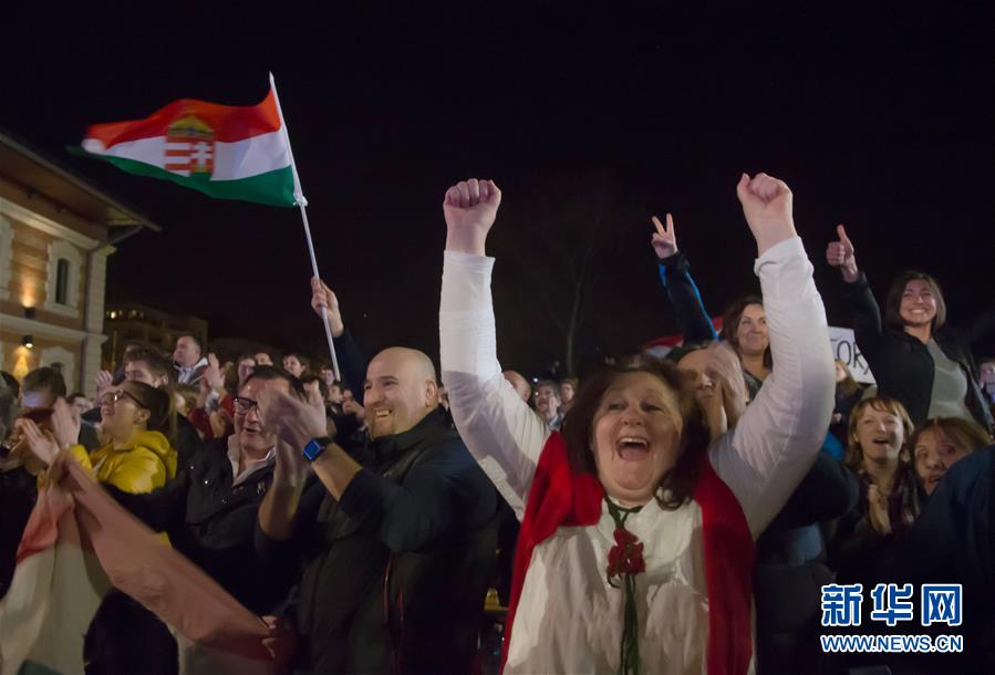 4月8日,在匈牙利首都布达佩斯,匈牙利总理欧尔班的支持者庆祝匈牙利执政联盟(青民盟和基民党)在国会选举中获胜。根据匈牙利国家选举办公室8日晚公布的初步计票结果,匈牙利执政联盟(青民盟和基民党)在当天举行的国会选举中获得压倒性胜利。新华社发(弗尔季·奥蒂洛摄)