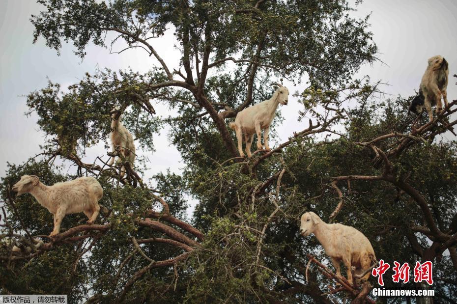 当地时间4月4日,在摩洛哥索维拉,几只山羊爬到阿甘树上,觅食摩洛哥坚果。据了解,这种奇特的场景只有在摩洛哥才能经常看到,由于山羊无法完全消化果实的果核,所以粪便中会留下果实的果核,而农民会搜集这些果核,榨取油用于烹饪和化妆品。